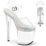 8" (100mm) Heel, 4" (200mm) Platform Ankle Strap Sandal Featuring Multiple Rows of Rhinestones on the Platform Top Edge and Heel