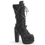 | | TORMENT-156 Blk Vegan Leather, 5 1/2" Heel, 3" PF | | Item # (SKU): TOR156/BVL | | Size: 6-11 | | 5 1/2" (140mm) Heel, 3" (76mm) Platform Lace-Up Front Knee High Boot Featuring Harness Strapped Front Platform, Crossing Metal Spiked Straps and Hanging Chain and Spiked Ball Charm Details, Inner Side Metal Zip Closure |